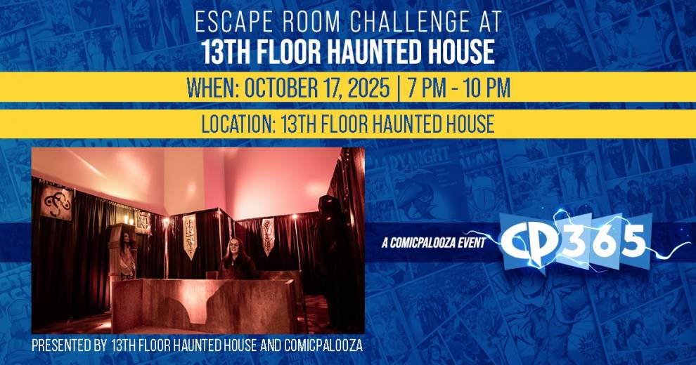The fright of your life meets the thrill of the challenge! CP365 is teaming up with 13th Floor Haunted House for a night of horror and fun. Can you beat the escape room in record time? The fastest three teams will take home Comicpalooza 2026 badges—and you also have the chance to win exclusive swag in our raffles.