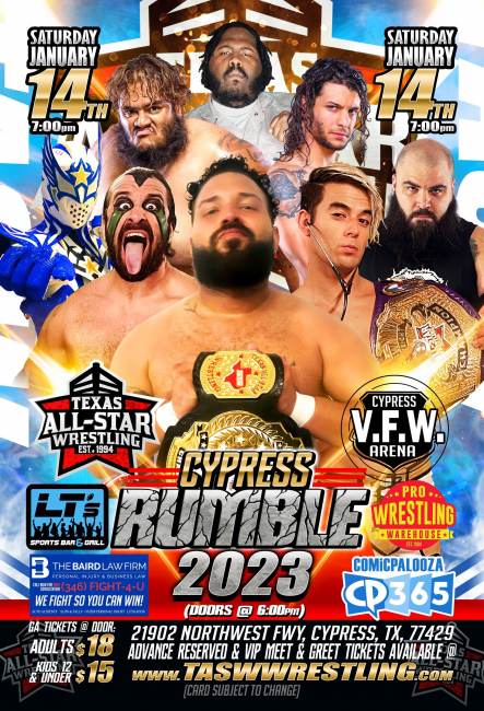 TASW LIVE pro wrestling action returns to The Historic Cypress VFW Arena for the 2023 “CYPRESS RUMBLE” on Saturday night January 14th starting at 7:00 PM!